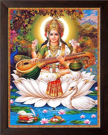 Art n Store: Goddess Saraswati with Swan HD Printed Religious & Decor Picture Painting with Plane Brown Frame (30 X 23.5 X 1.5 cm_ Brown Wood): Amazon.in: Home & Kitchen
