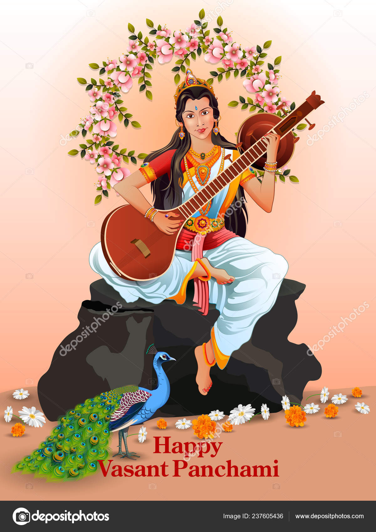 Vector illustration of a Background for Goddess Saraswati for Vasant Panchami Puja Stock Photo - Alamy